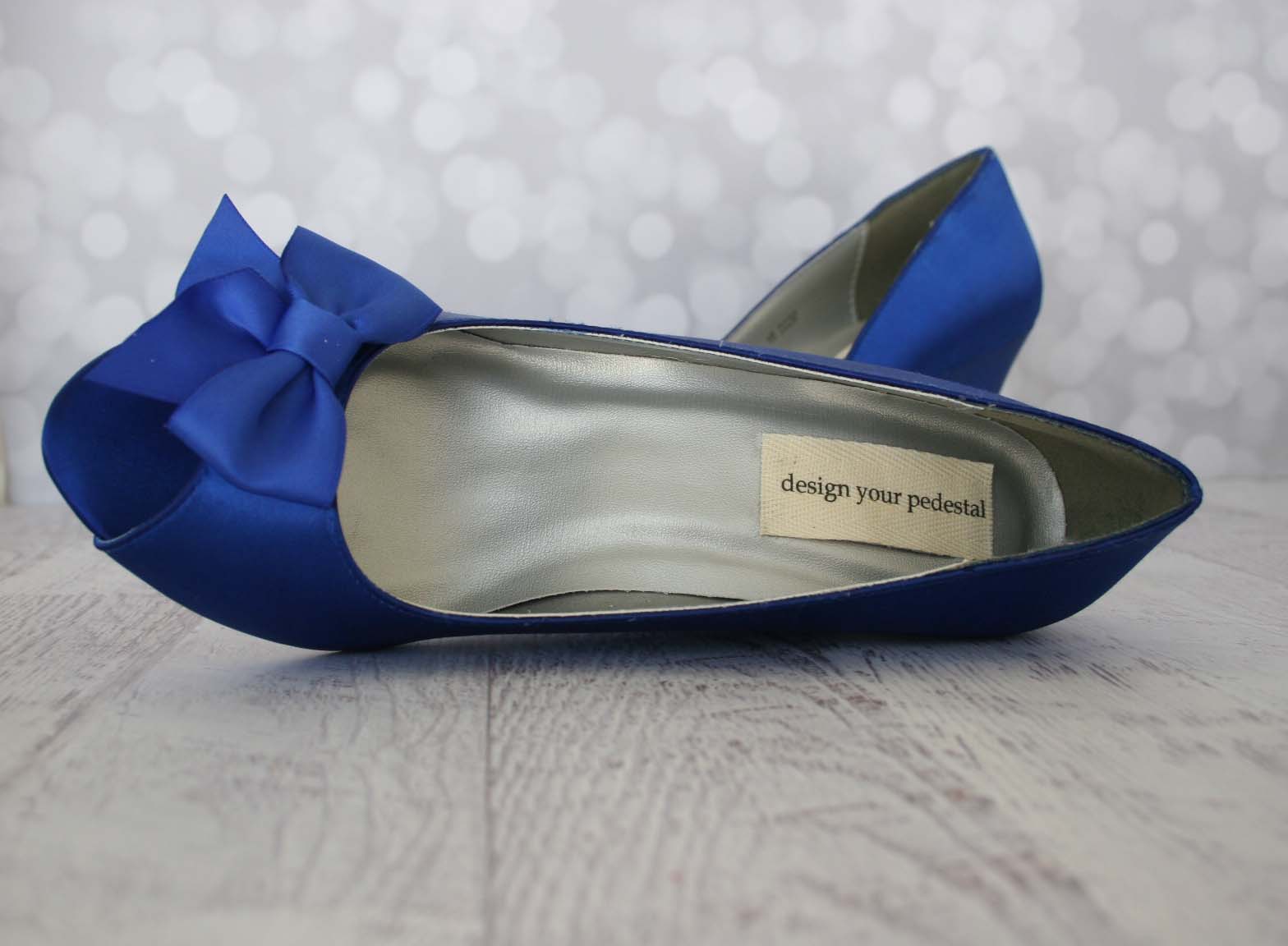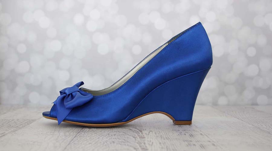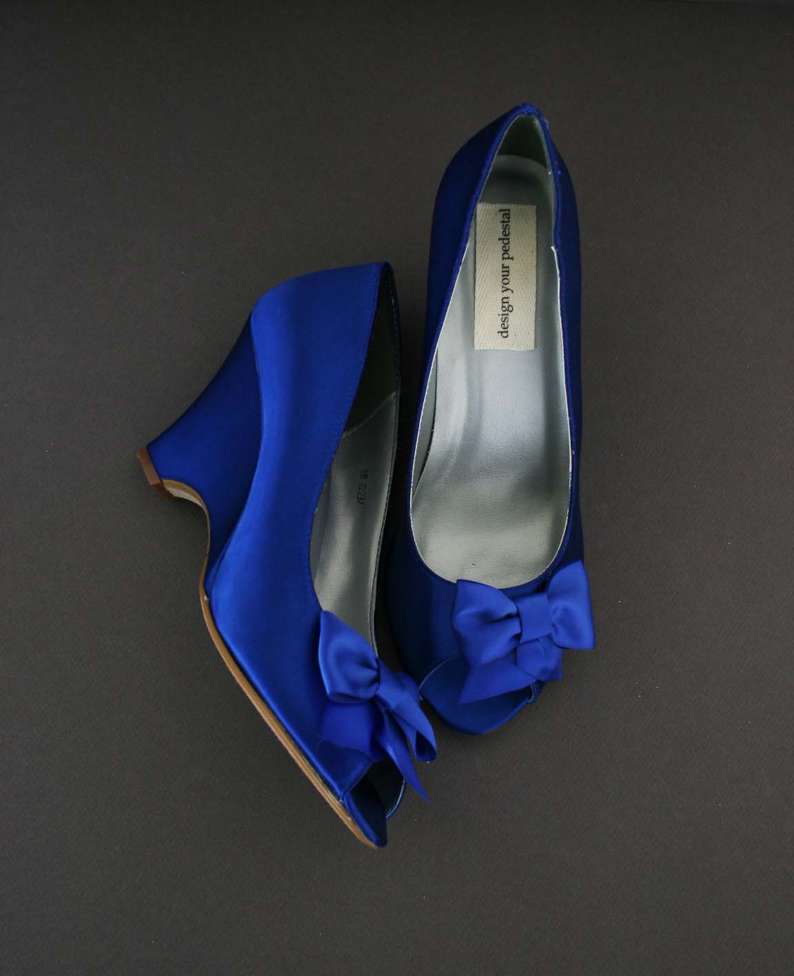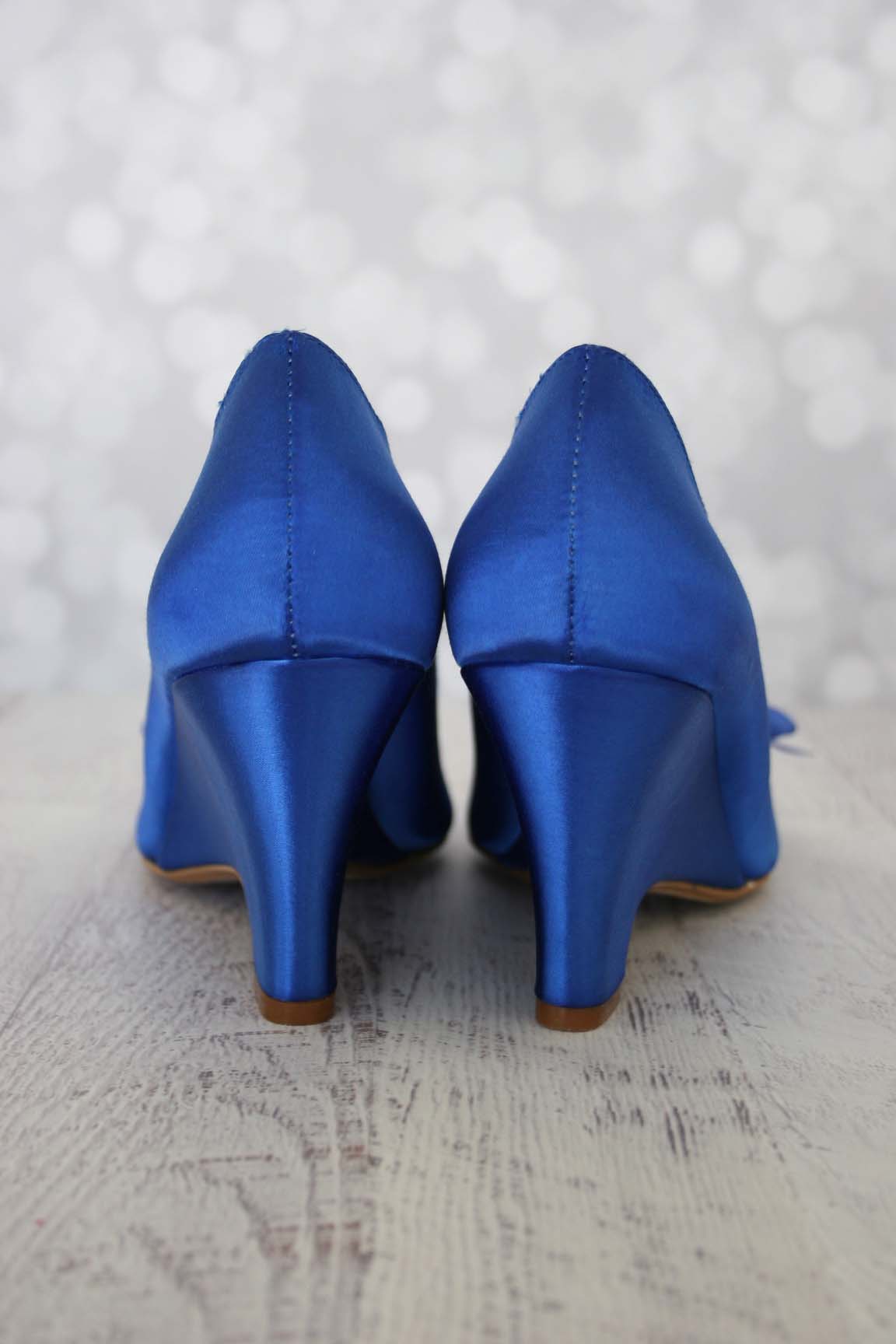 Dress up your trip down the aisle with these pretty 2 1/2″ (measured like this) peep toe wedge wedding shoes, shown here in royal blue with a handmade off center bow situated off center on the toe.