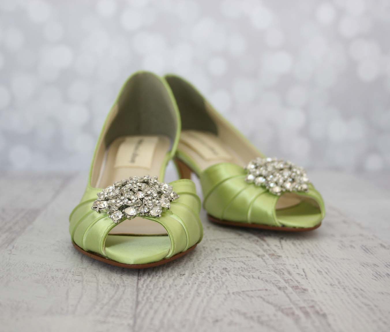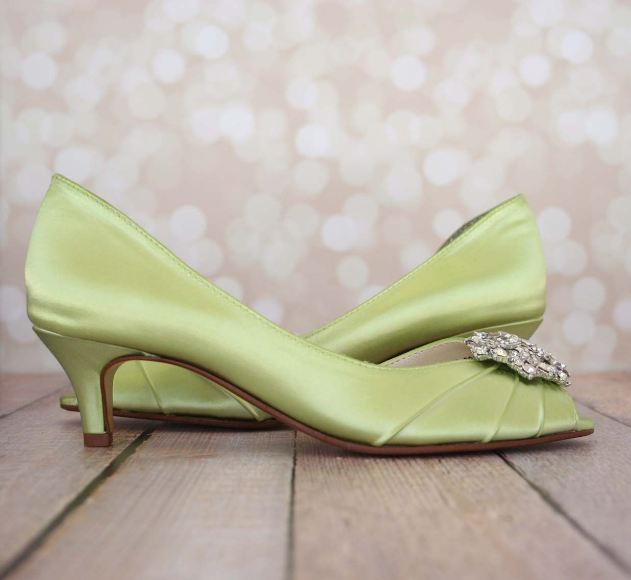 Spring Green Kitten Heel Peep Toe Wedding Shoes with Classic Rhinestone Cluster