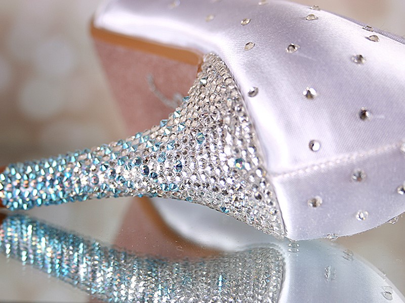 Dress up your trip down the aisle with these made-to-order white wedding shoes. These platform peep toe bridal heels feature a hand designed silver and turquoise ombre crystal covered heel and a light scattering of silver crystals scattered on the heel cup. The perfect way to make your wedding dress jealous!