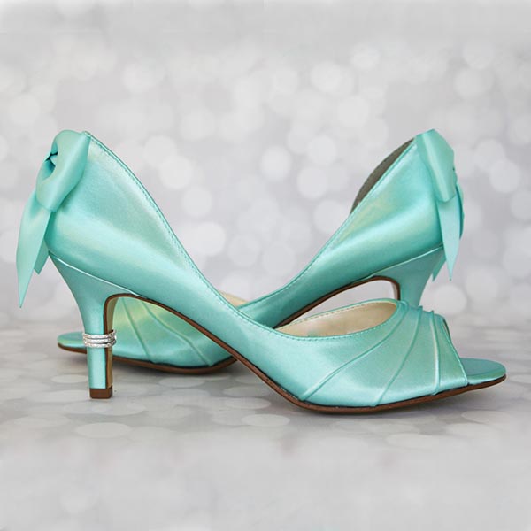 Dress up your trip down the aisle with these pretty 2 1/2″ (measured like this) peep toe wedding shoes, shown here in aqua with a handmade matching bow on the back of the shoe and a silver ring on the heel. This shoe can also be made in a 1 3/4″ and 3 1/2″ heel.