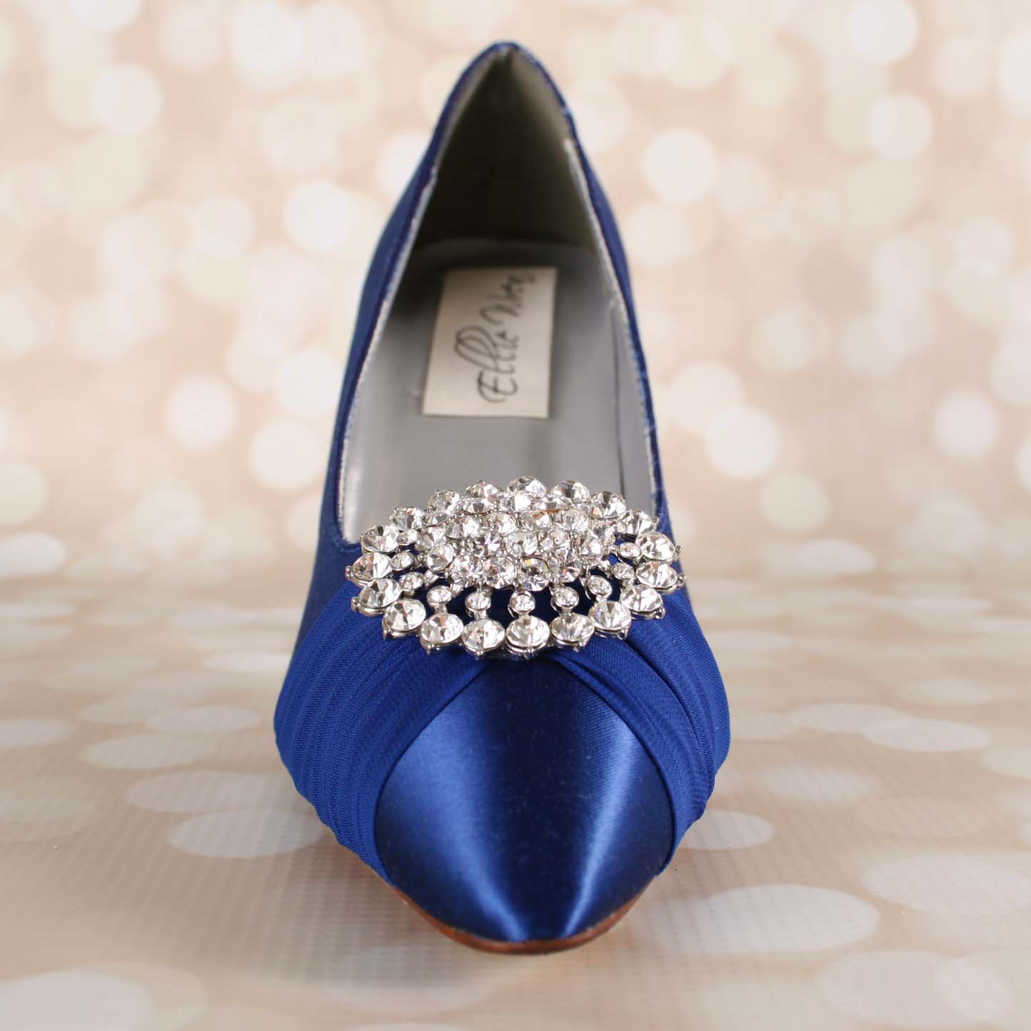 Dress up your trip down the aisle with these pretty 3 1/2″ (measured like this) closed toe wedding shoes, shown here in royal blue with a hand placed royal blue chiffon sash secured at the top of the shoe with the silver oval crystal adornment from our custom curated collection.
