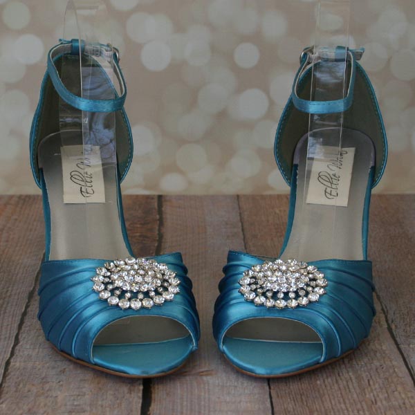 Find a new way to do your “something blue” with these brilliant turquoise blue peep toe wedding wedges.  These sandal style bridal shoes are the perfect accent for your trip down the aisle, featuring the large silver crystal oval adornment from our curated adornments collection.