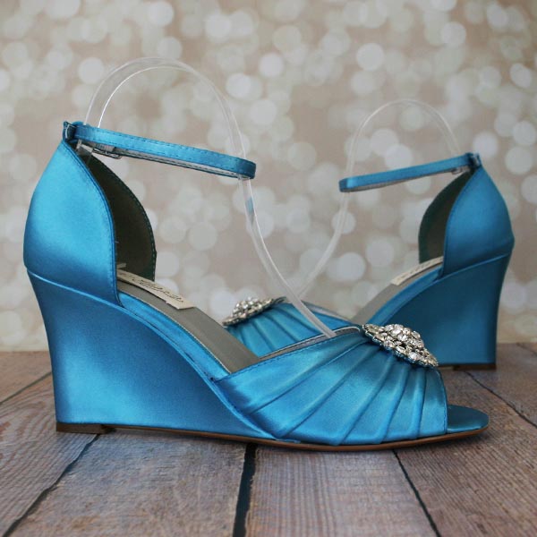 Blue Wedding Wedges:  Turquoise Blue Peep Toe Wedge Sandals with Silver Crystal Oval Adornment
