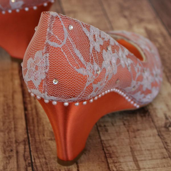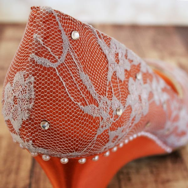 Dress up your trip down the aisle with these made-to-order burnt orange wedding shoes. These peep toe wedges feature a hand placed gray lace overlay with silver crystals scattered in the lace and a row of silver crystals along the wedge heel of the shoe.