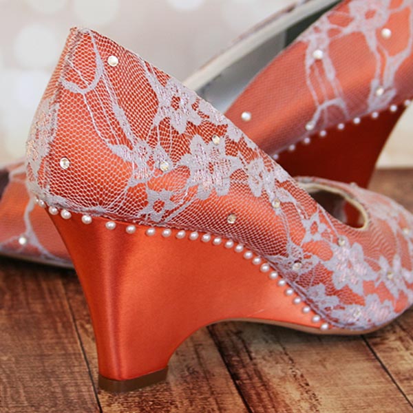 Burnt Orange Wedding Shoes: Peep Toe Wedge Bridal Shoes with Gray Lace Overlay and Crystal Accents