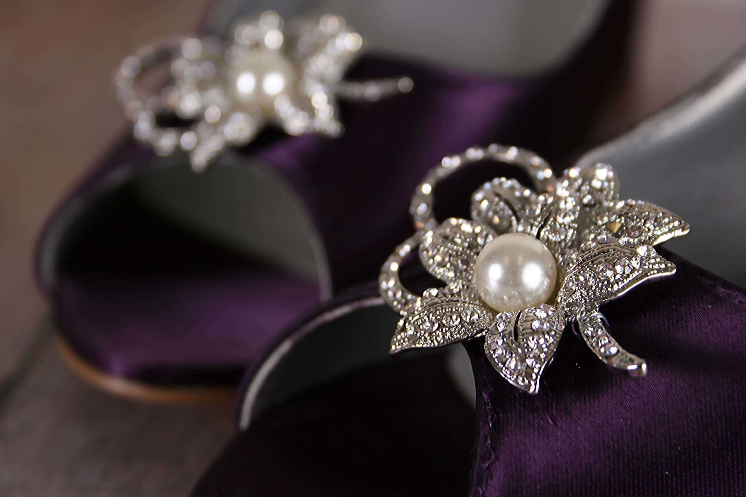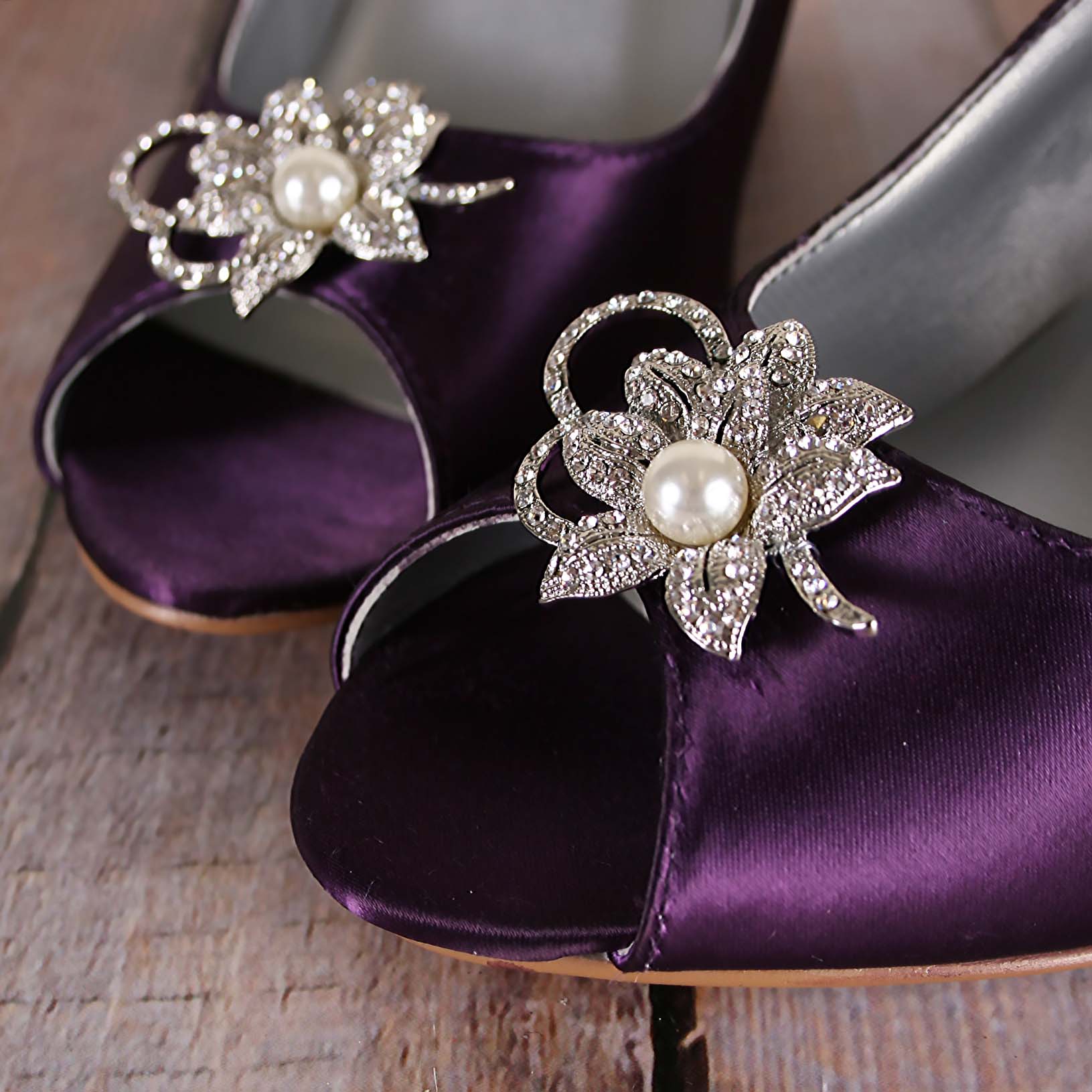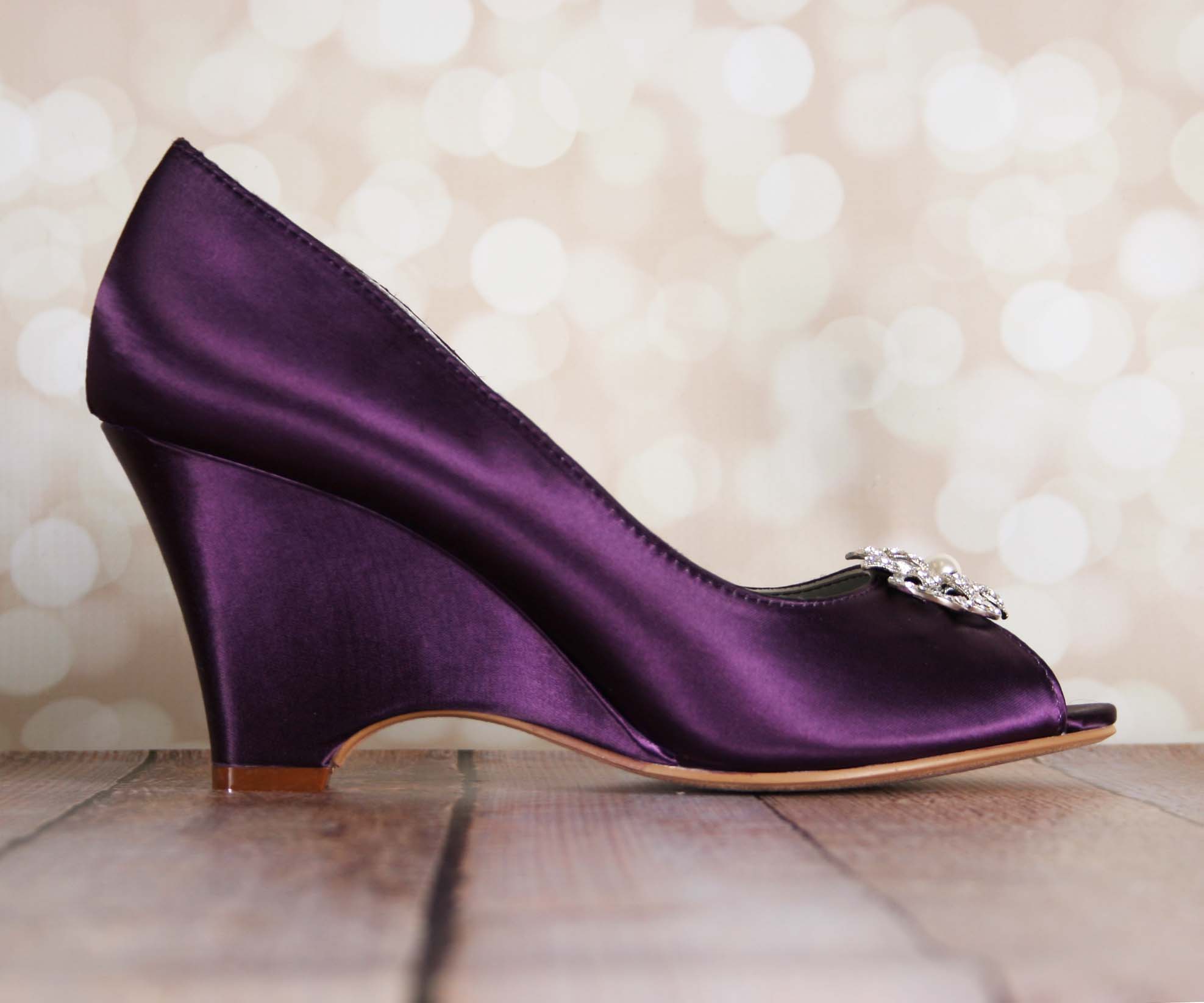 Dress up your trip down the aisle with these custom designed eggplant purple wedding shoes. These peep toe wedge bridal heels feature our custom curated crystal and pearl looped flower adornment on the toe.