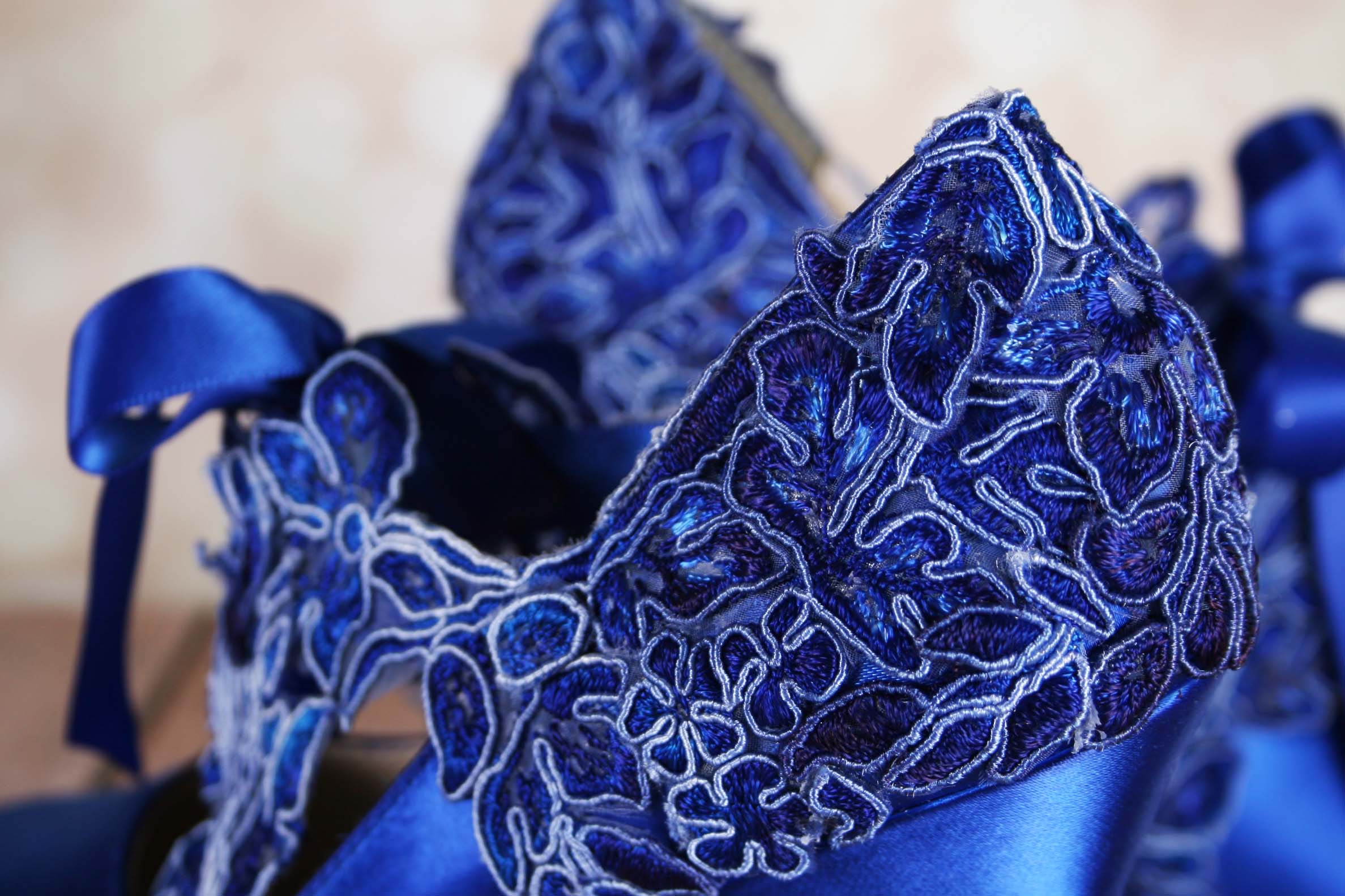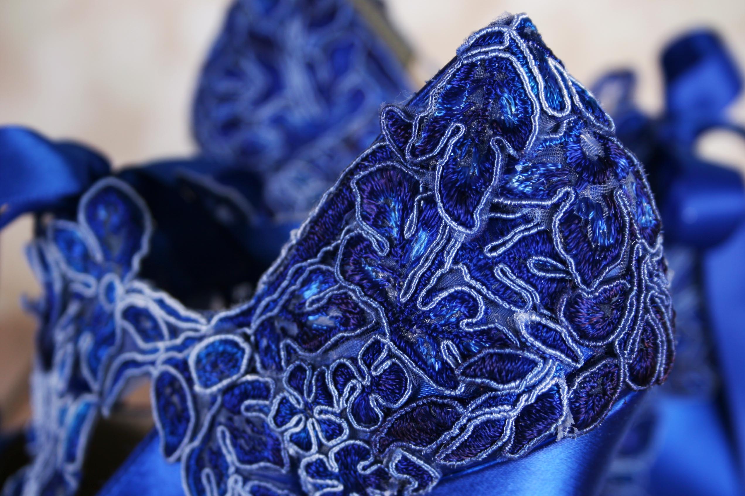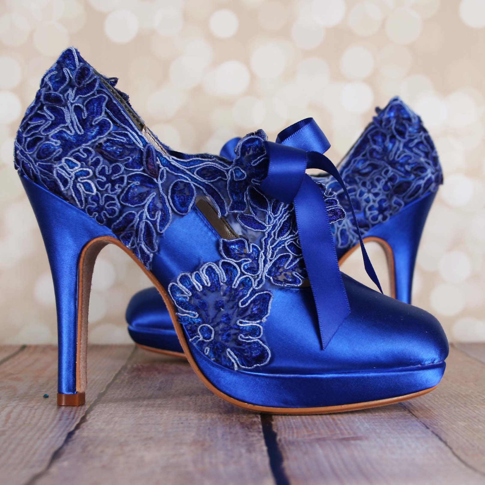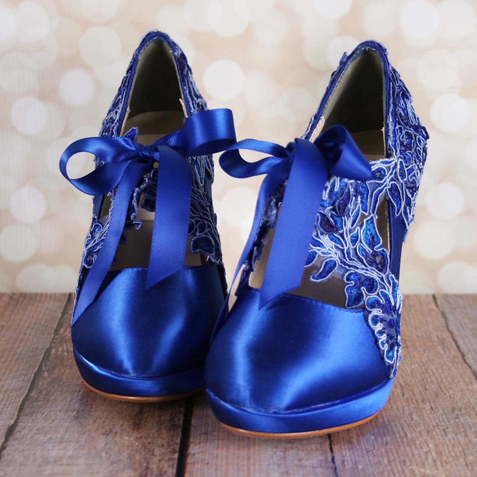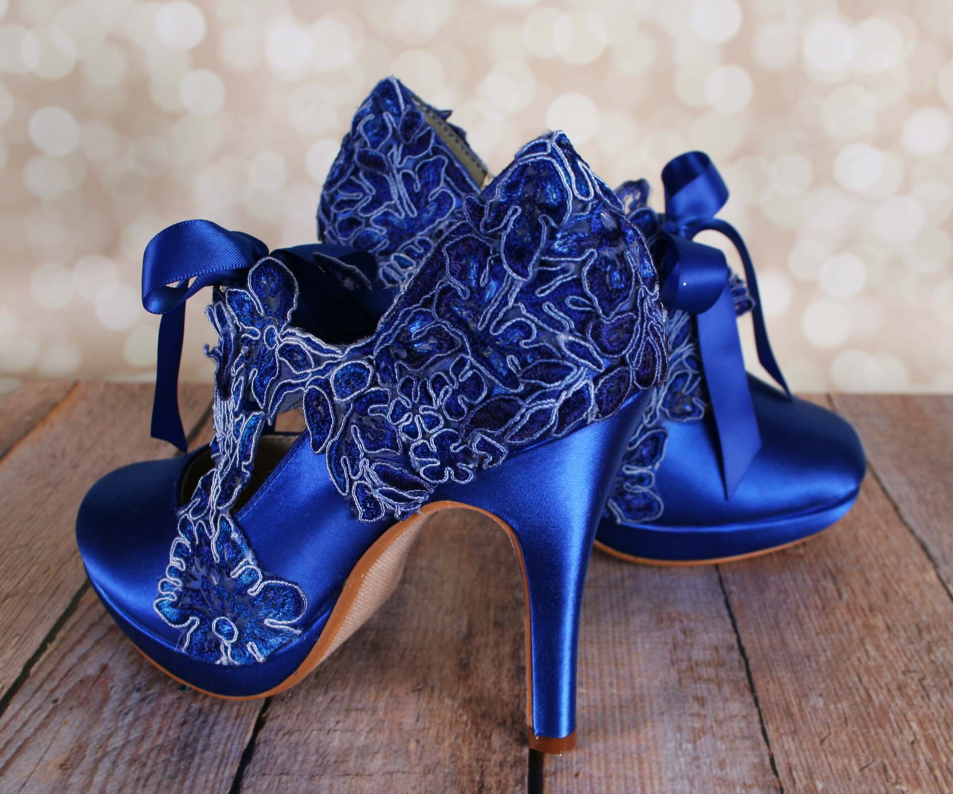 Dress up your trip down the aisle with these custom designed royal blue wedding shoes. These platform bridal heels feature a hand-dyed, hand-cut lace overlay that is joined at the top of the foot Mary Jane style with a royal blue satin bow.