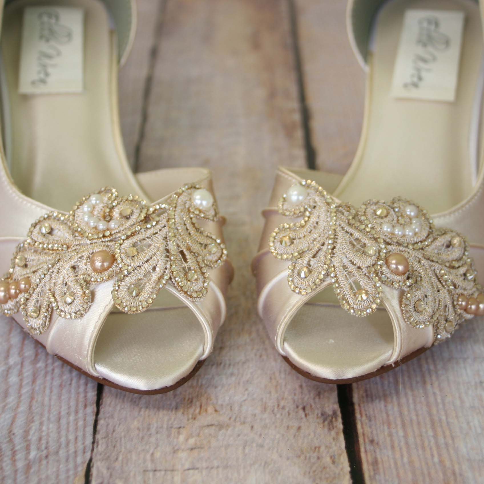 We work one-on-one with each of our brides to determine their dream wedding shoe style, complete with shoe try-on options and pre-purchase design sketches (if you’d like). Once an order is placed, we regularly communicate with our brides, confirming details and sending photos as the shoes progress.