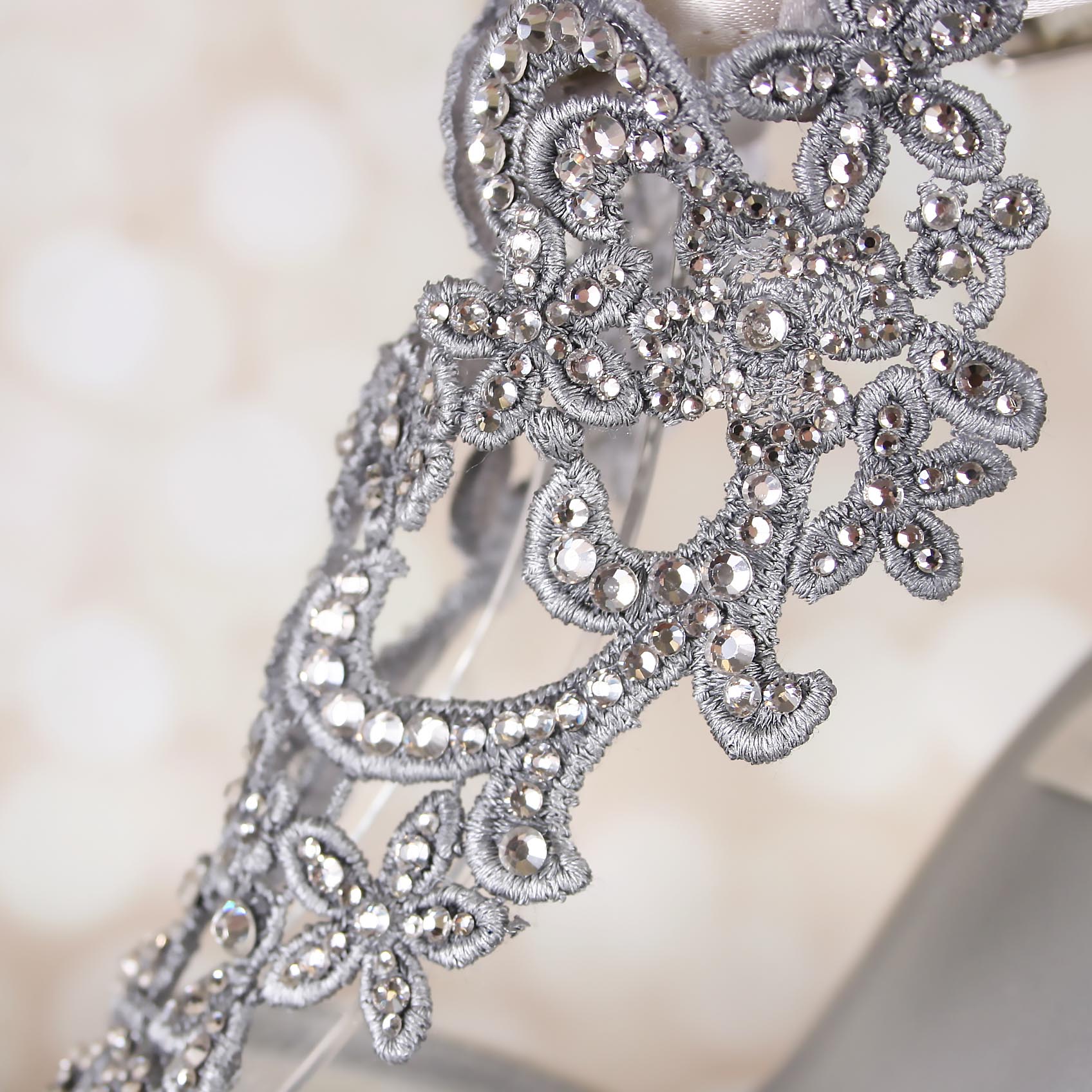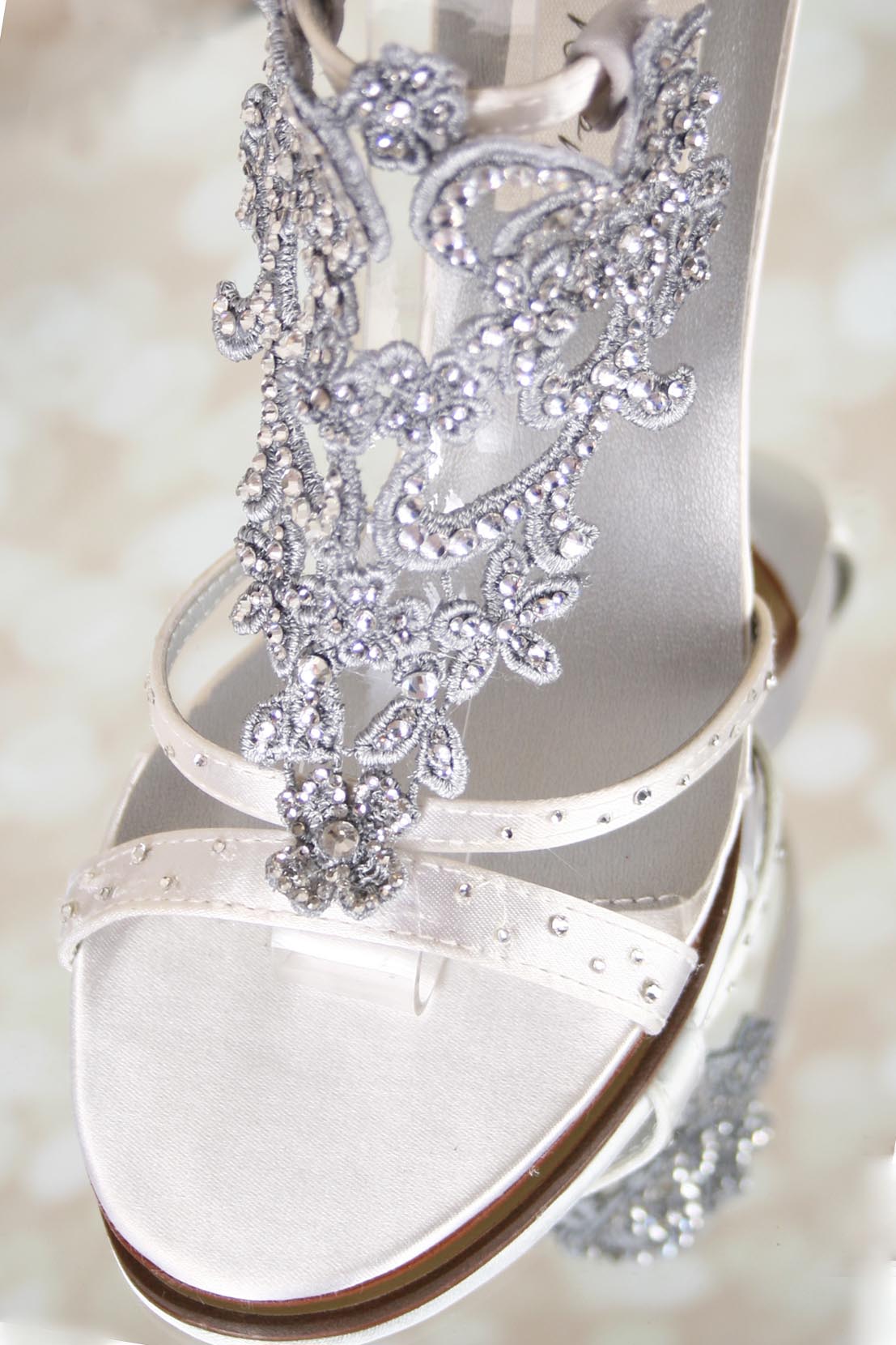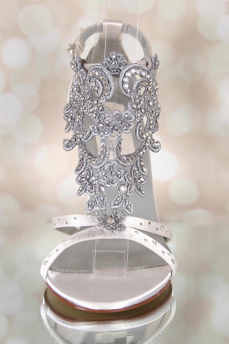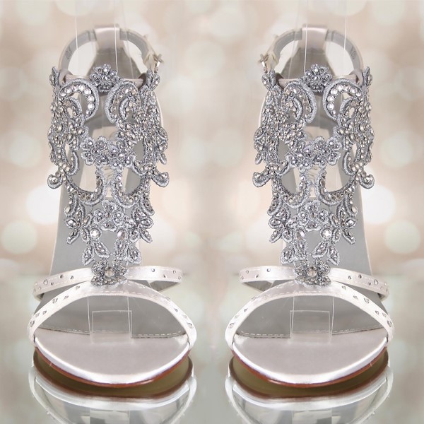 Dress up your trip down the aisle with these made-to-order ivory wedding sandals. These bridal heels feature a handmade silver crystal covered applique on the toe — the perfect accent to make your wedding dress jealous!