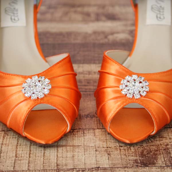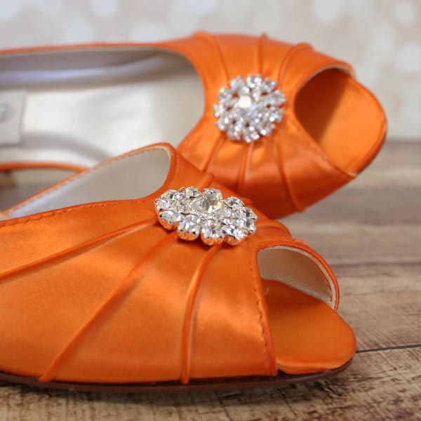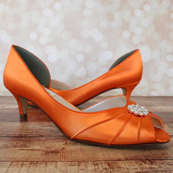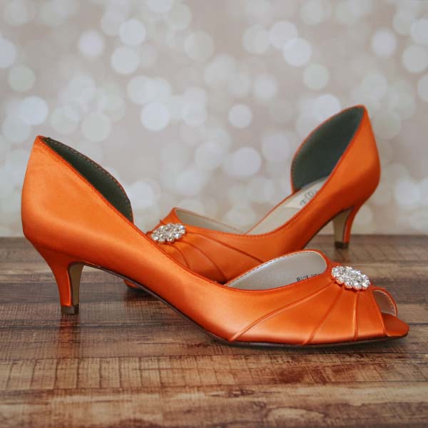 Orange Wedding Shoes: Kitten Heel Peep Toe Bridal Shoes with Simple Rhinestone Adornment
