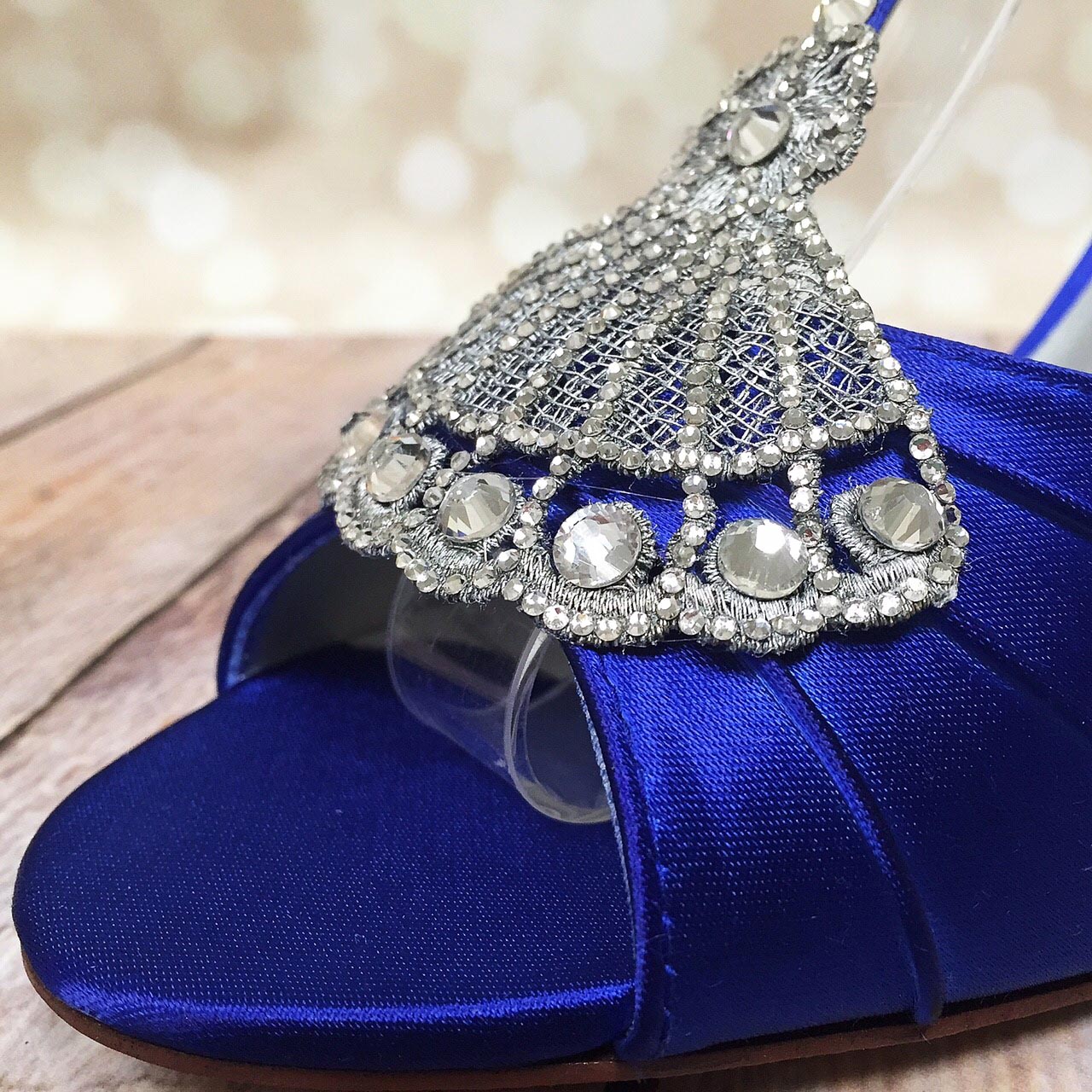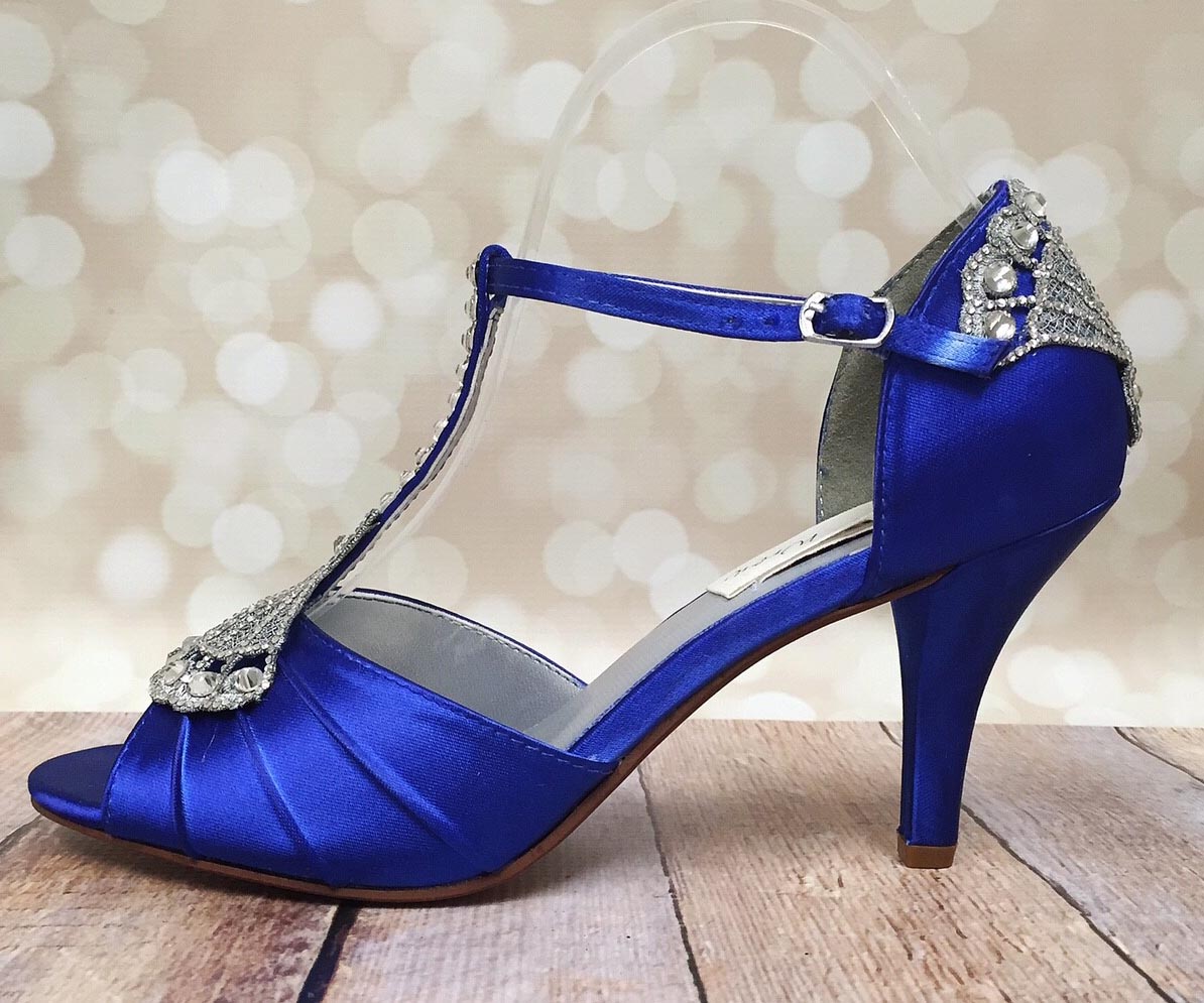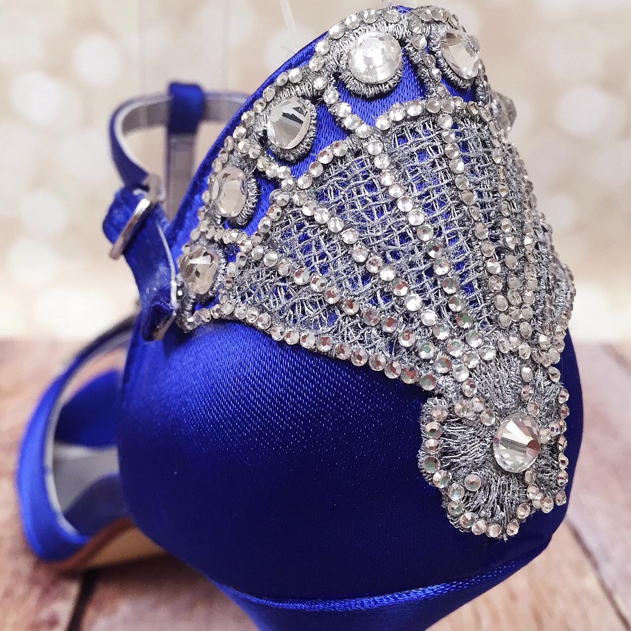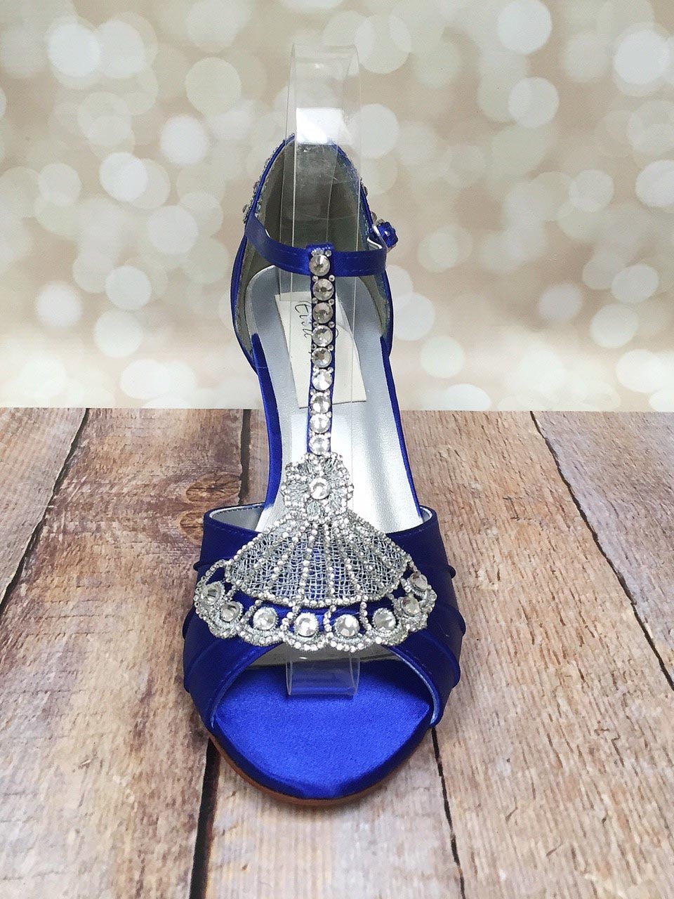 Royal Blue Wedding Shoes: Blue Bridal Heels with Silver Crystal T-Strap and Handmade Art Deco Appliques on Heel Cup and Toe